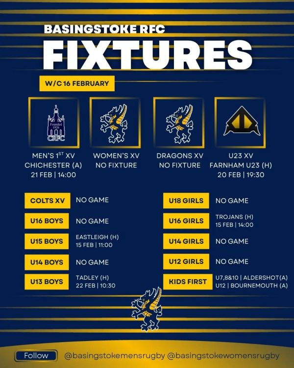 Weekend Fixtures: 21 - 22 February Thu 19 Feb 2026 13:44 THIS WEEKEND Friday Night Lights for our U23 XV, hosting Farnham in a 19:30 kick off tomorrow! A rescheduled run out for the 1st XV, heading down to Chichester A top of the table clash for our U16 Girls, facing Trojans in the cage on Sunday Home games for our U15 and U13 Boys! With all that and the Six Nations being shown at the club, it's another rugby filled weekend! Come on down and support your local club!
